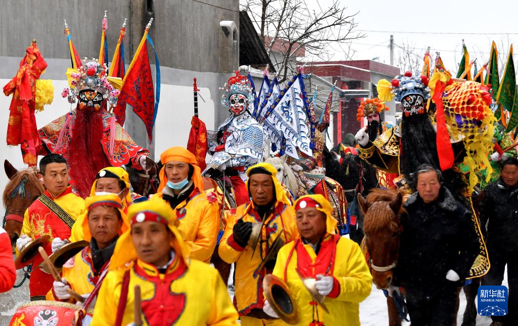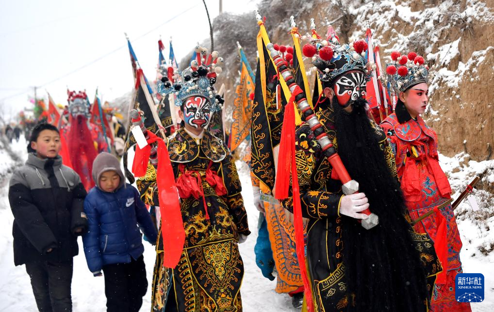 2月23日,陕西省宝鸡市陇县东南镇黄花峪村在进行社火游演。