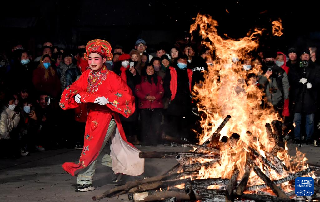 2月23日,陕西省宝鸡市陇县东南镇黄花峪村在进行地台社火表演。