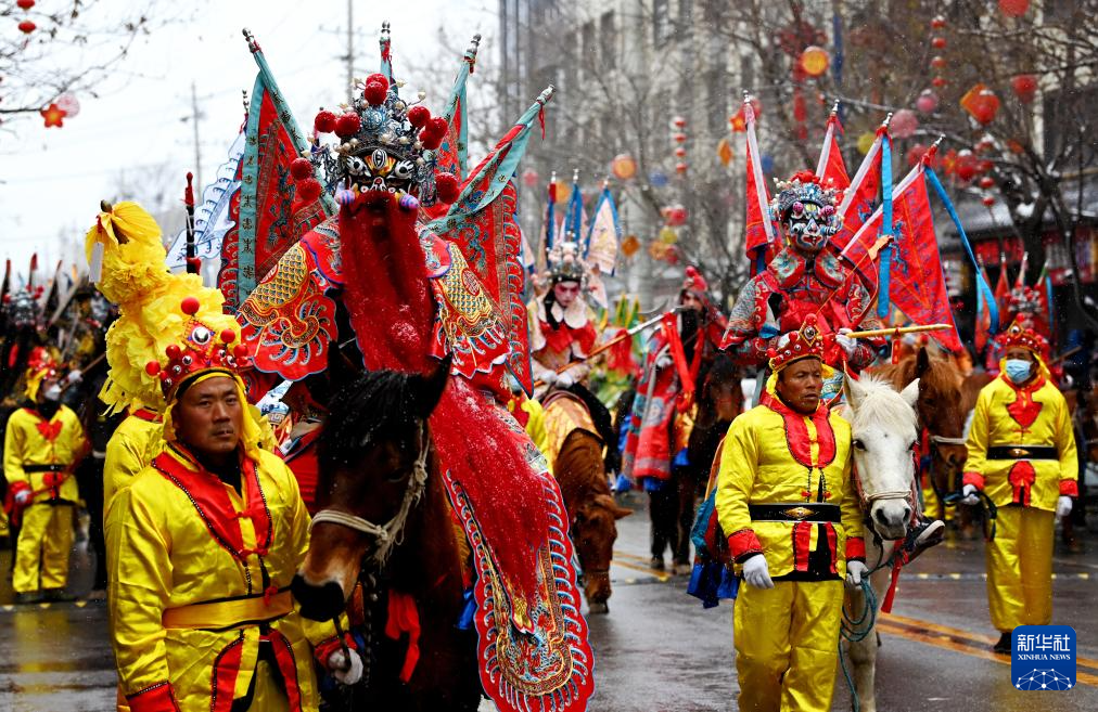 2月23日,陕西省宝鸡市陇县东南镇黄花峪村在进行马社火游演。
