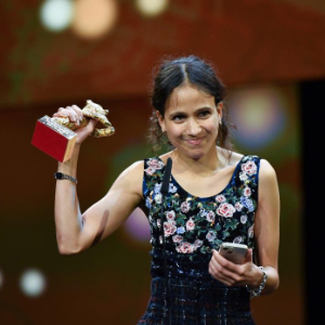2月24日,在德国柏林,纪录片《达荷美》导演马蒂·迪奥普在第74届柏林电影节颁奖仪式上领奖。