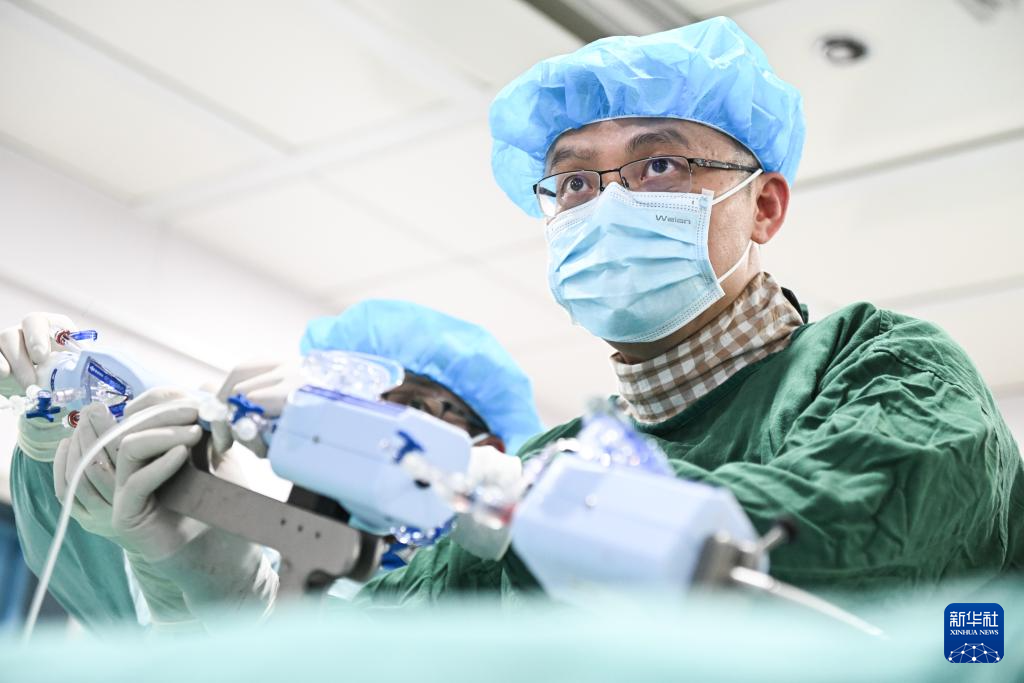 在南京市第一医院,张俊杰(右)和团队在心导管室为患者进行经导管二尖瓣缘对缘修复手术(2月20日摄)。