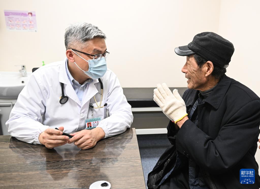 在南京市第一医院专家门诊室,一名89岁的患者双手合十,感谢张俊杰(2月20日摄)。1月1日,老人转院至南京市第一医院时处于危重症状态(心源性休克)。2日,张俊杰对老人成功实施了经导管主动脉瓣置换手术。