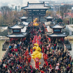 当日是农历正月十六,安徽省滁州市全椒县传统民俗活动“走太平”拉开帷幕,巡游队伍穿过太平桥,献上精彩纷呈的民俗表演。