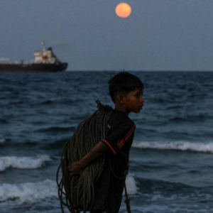 2月24日,一名男孩走在印度尼西亚亚齐省司马威的海岸边,身后明月高悬。
