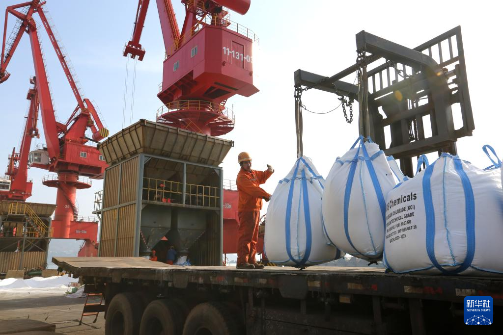 2月27日,在江苏连云港港口码头,工人将卸下的化肥装车。