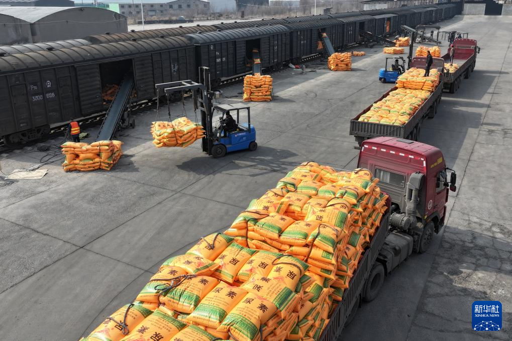 2月27日,在山西省稷山县丰喜泉稷能源有限公司发运站,工作人员在装运化肥(无人机照片)。