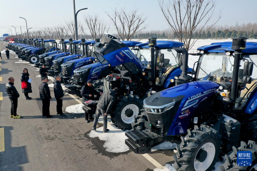 2月27日,在安徽省蒙城县农机农资大市场,农民在选购大马力拖拉机,为即将到来的春耕生产做准备(无人机照片)。