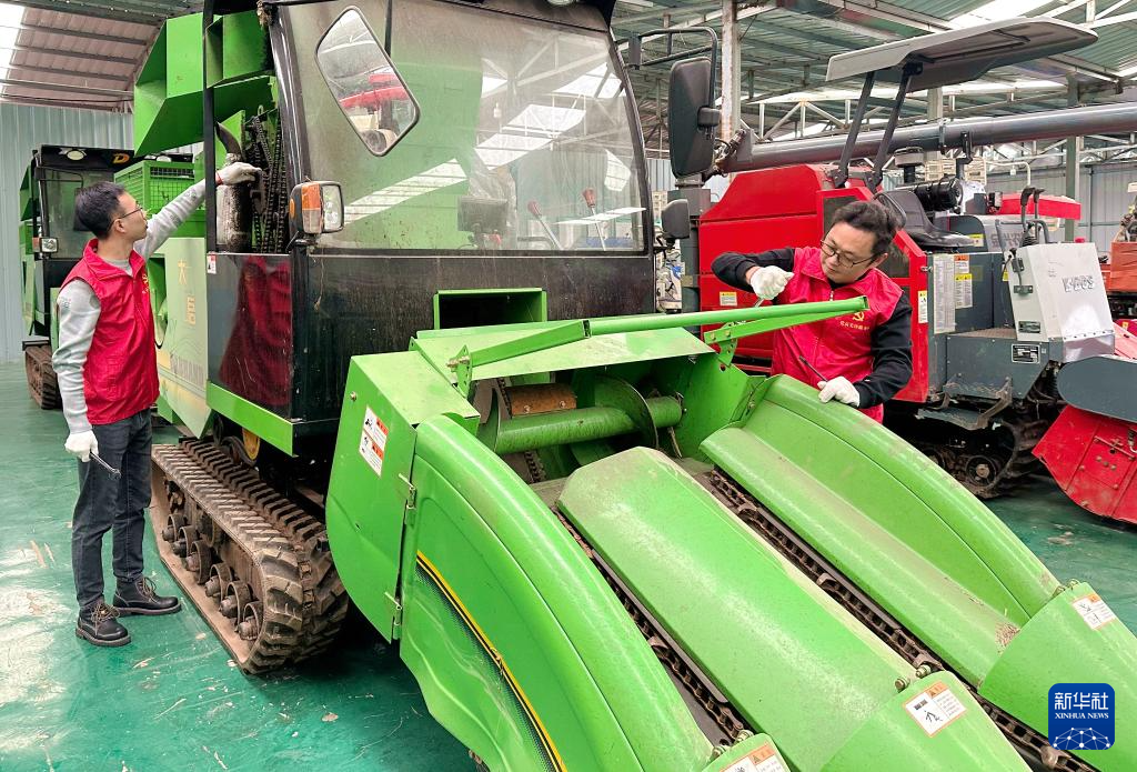 2月27日,在四川省仁寿县珠嘉镇五谷园农业专业合作社,农机服务小分队在检查、维护农机。