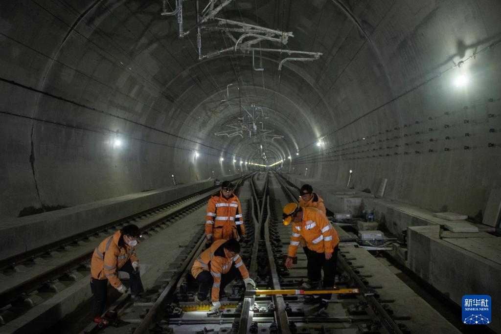 2月27日,铁路宁波工务段职工在杭温铁路磐安隧道内对轨道进行精调作业。