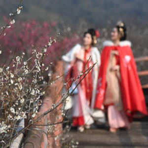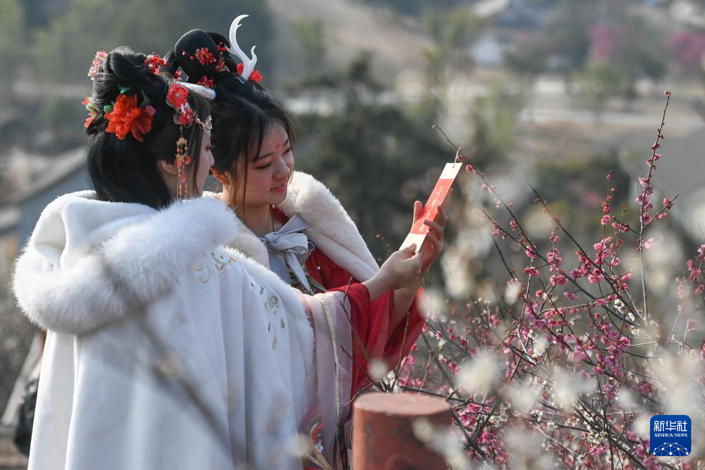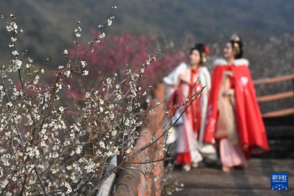 2月27日,身穿古代服装的游客在原乡小镇景区内的瀛洲梅园赏梅。