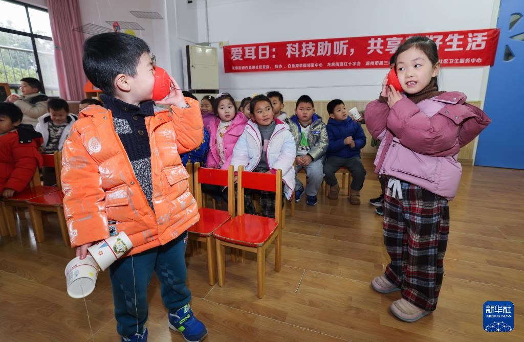 2月28日,湖州市第三幼儿园的小朋友用自制的传声筒感受音量对听力产生的影响。