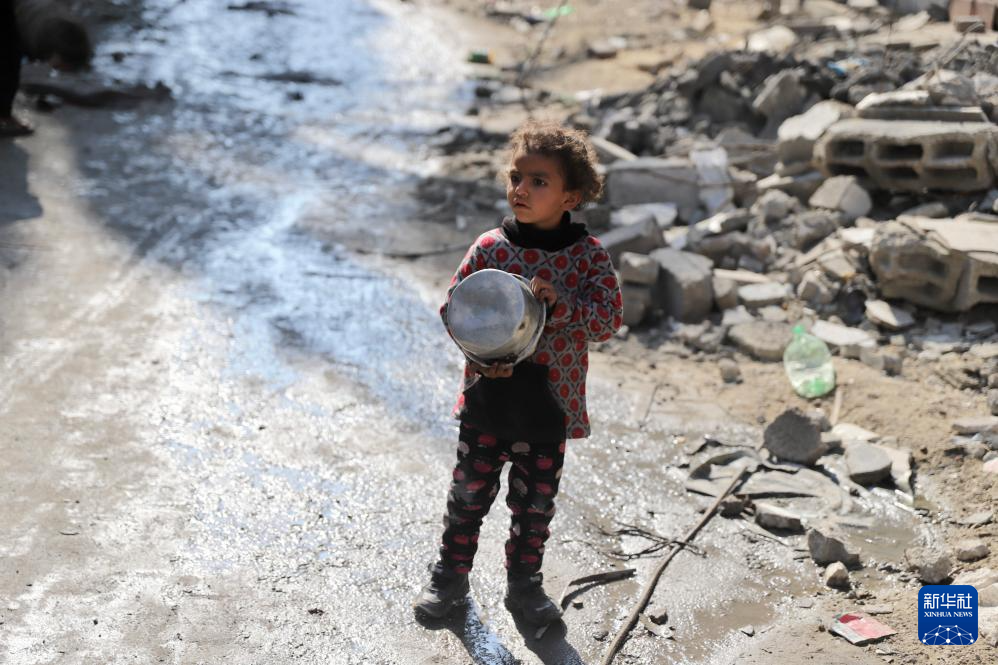 2月27日,在加沙地带北部的杰巴利耶难民营,一名儿童等待领取食物。