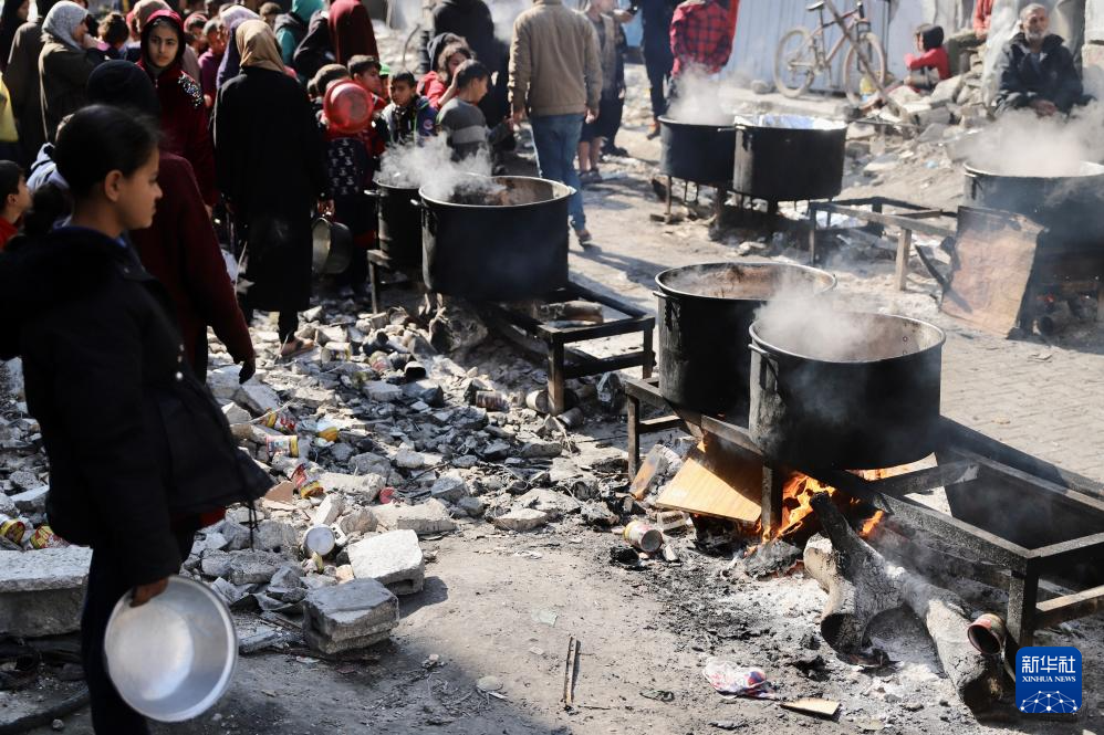 2月27日,在加沙地带北部的杰巴利耶难民营,人们等待领取食物。