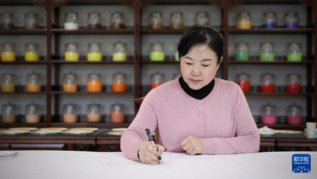 2月27日,刘晶涛在凤城市边门镇的车间里绘制长幅景泰蓝珀晶画画稿。