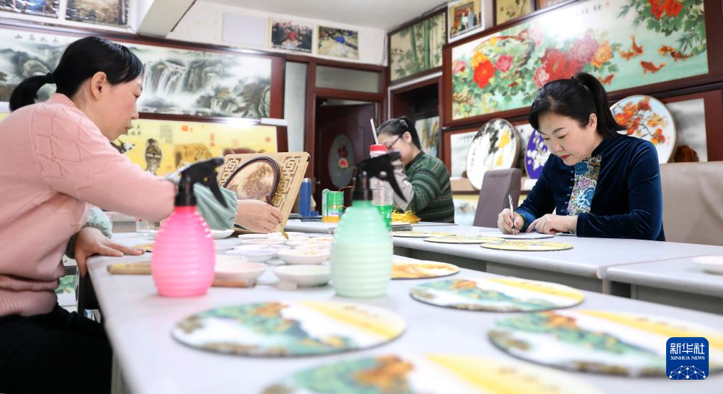 2月22日,刘晶涛(右)和徒弟们在凤城市内的工作室进行景泰蓝珀晶画创作。