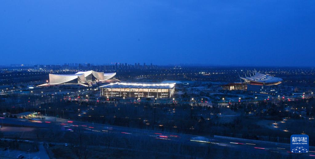 北京艺术中心、北京城市图书馆和北京大运河博物馆夜景(从左至右,2月28日摄)。