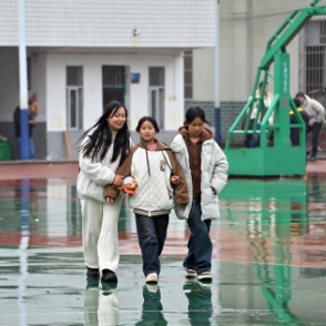 在桂林市全州县蕉江瑶族乡中心小学,21岁的凤艳萍(左)和妹妹盘云芳(右)、堂妹盘宇婷走在校园里(2024年2月28日摄)。