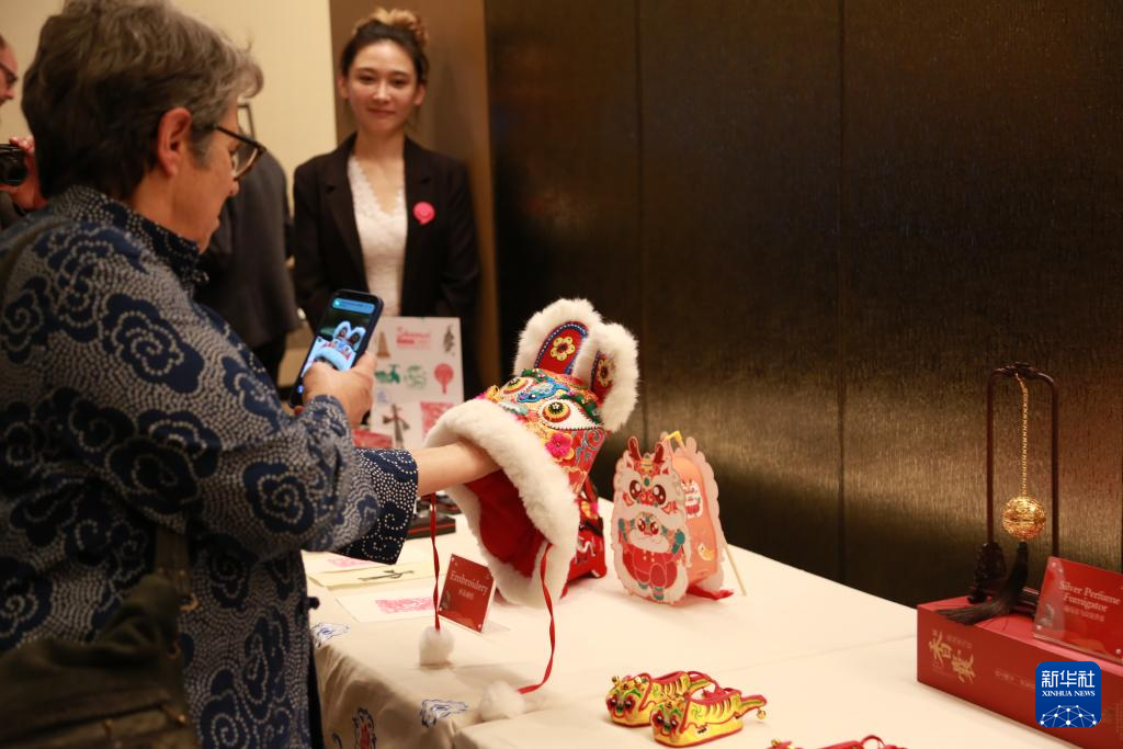 2月27日,在美国纽约,一名参会者在陕西省文化和旅游厅与中国驻纽约旅游办事处举办的陕西文化旅游推介会上拍摄陕西民俗产品。