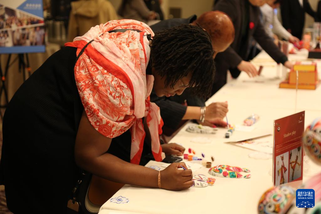 2月27日,在美国纽约,参会者在陕西省文化和旅游厅与中国驻纽约旅游办事处举办的陕西文化旅游推介会上学画脸谱。