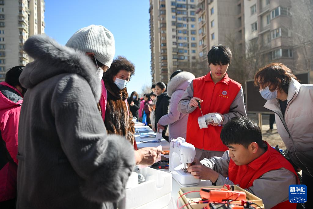 3月1日,天津市劳动保障技师学院的志愿者在百合春天社区开展家电维修志愿服务。