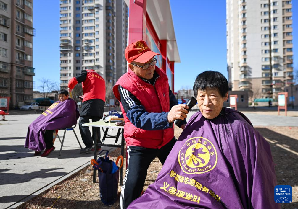 3月1日,在天津市百合春天社区,志愿者为居民义务理发。