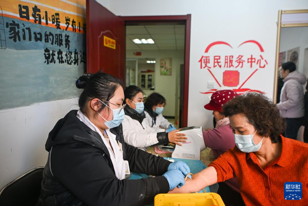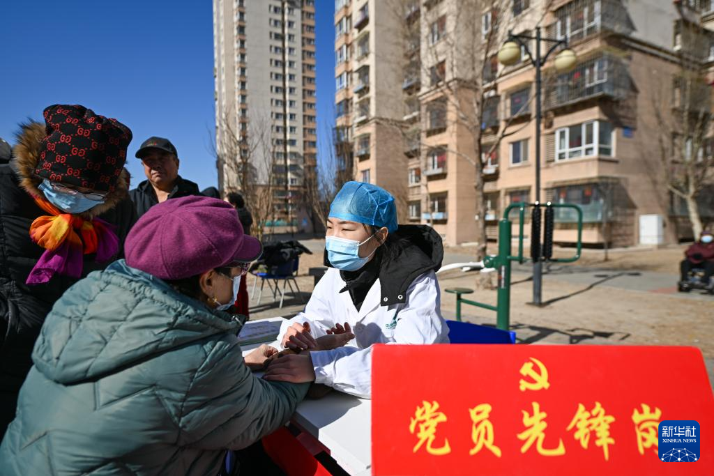 3月1日,在天津市百合春天社区,志愿者为居民提供义诊服务。