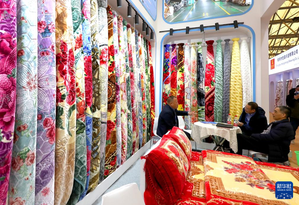 3月1日,展客商在一家毛毯企业展台上交流洽谈。