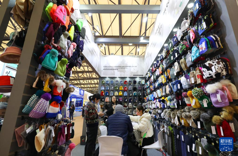 3月1日,展客商在一家服饰企业展台上交流洽谈。