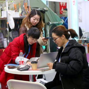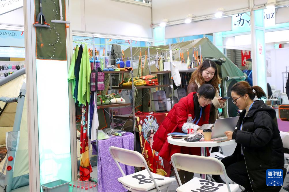 3月1日,展客商在一家露营装备企业展台上交流洽谈。