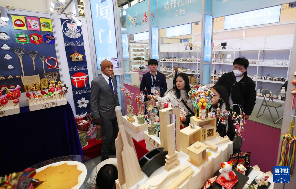 3月1日,几名采购商(右)在一家日式装饰品展位前驻足观看。