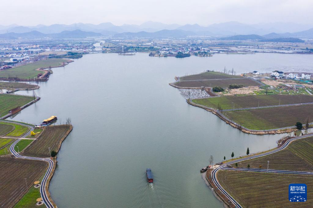 3月1日,游船行驶在鉴湖国家湿地公园的湖面上(无人机照片)。