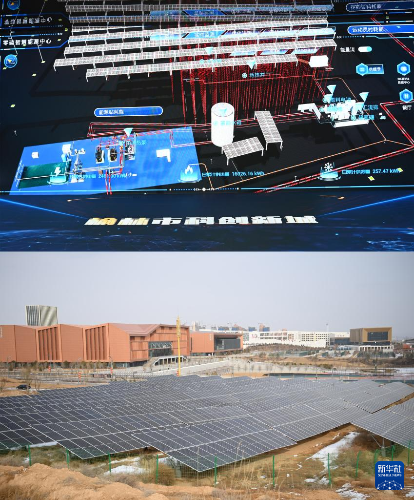 拼版照片:上图为榆林科创新城零碳分布式智慧能源中心的数字孪生系统,可用于实时监测;下图为榆林科创新城零碳分布式智慧能源中心的光伏板(2月28日摄)。该项目实现了含氢能的零碳多能源供需系统的实用化和规模化示范应用,为实现碳达峰、碳中和目标提供新的技术路径。