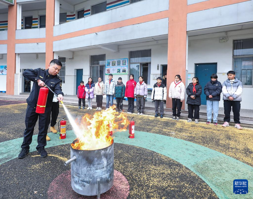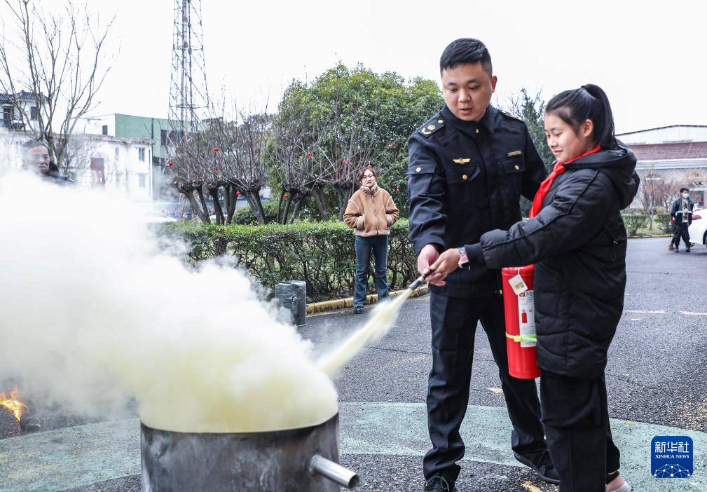 3月1日,东林镇应急管理服务中心工作人员给学生示范灭火器的正确使用方式。