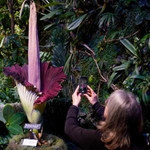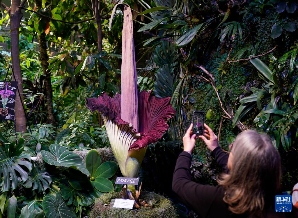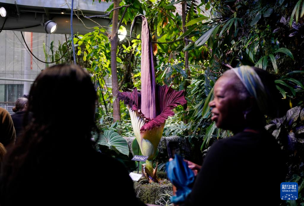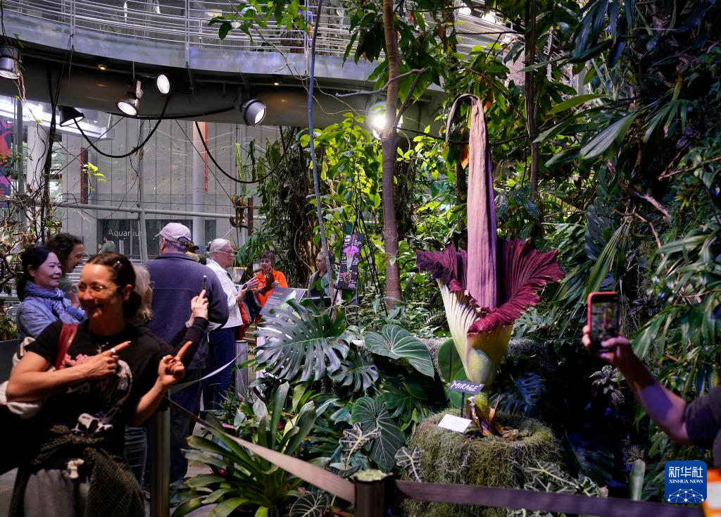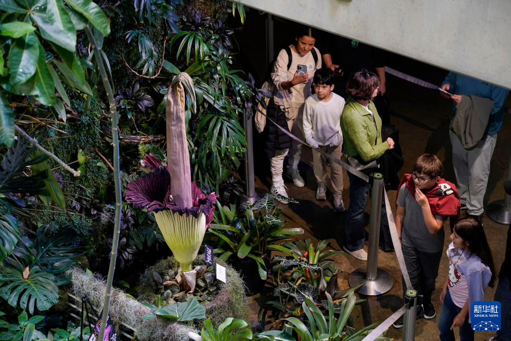 当日,美国旧金山加州科学博物馆内一株开花的巨魔芋吸引大批游客观赏。巨魔芋原产于印度尼西亚苏门答腊岛的热带雨林,每隔7至10年开花一次,每次开花时间只有24至36个小时。