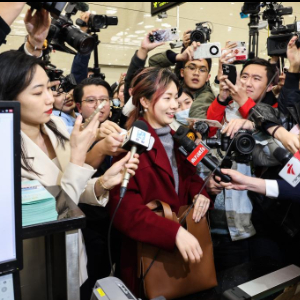 3月1日,澳门市民程曦(红衣)在横琴口岸接受媒体采访。她是横琴粤澳深度合作区正式封关运行后首位通关的旅客。