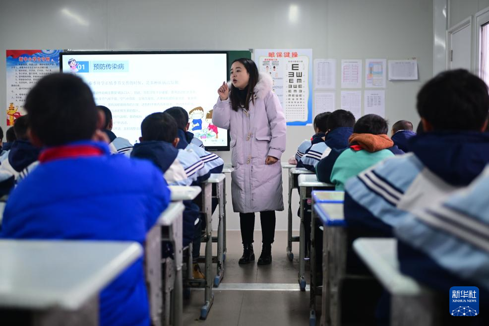 3月1日,官亭镇中心学校教师马荣芳在“板房教室”里给学生上开学第一课。