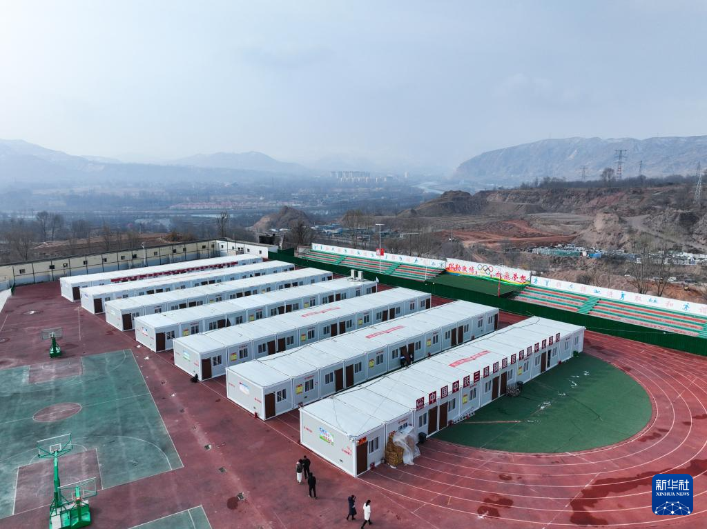 这是3月1日在青海省海东市民和回族土族自治县官亭镇中心学校拍摄的“板房学校”(无人机照片)。