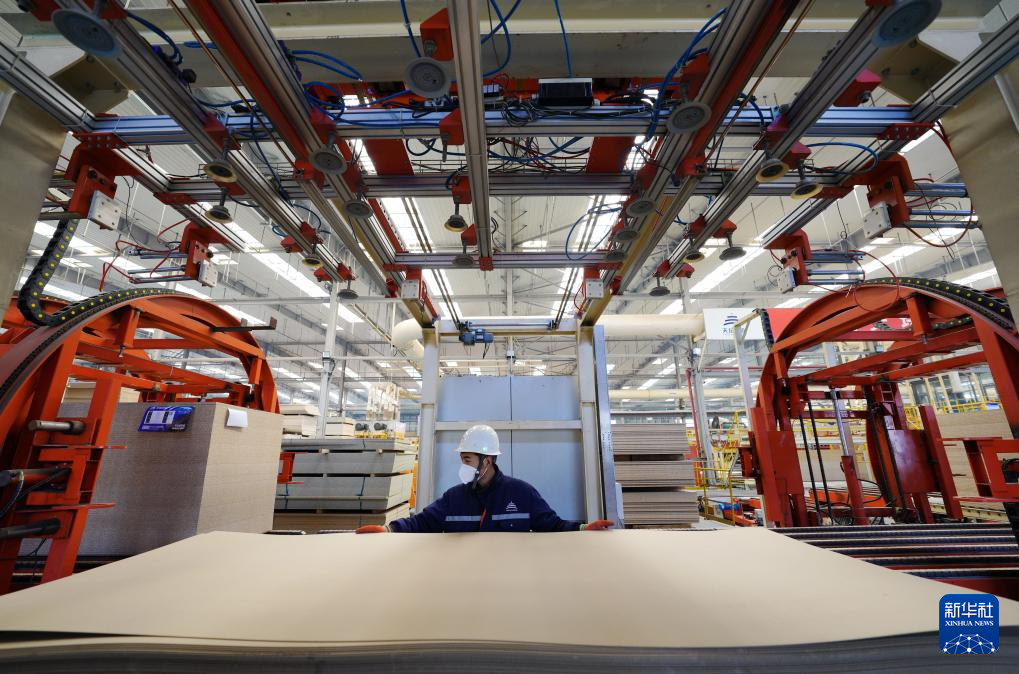 3月1日,工人在河北省唐山市曹妃甸区金隅天坛(唐山)木业科技有限公司生产车间工作。