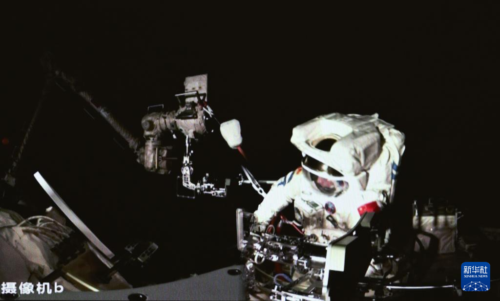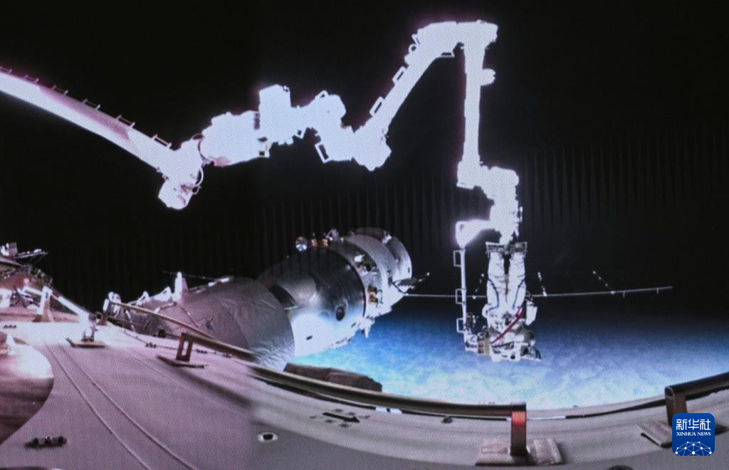 3月2日,在北京航天飞行控制中心拍摄的神舟十七号航天员江新林在空间站机械臂的辅助下进行舱外作业。