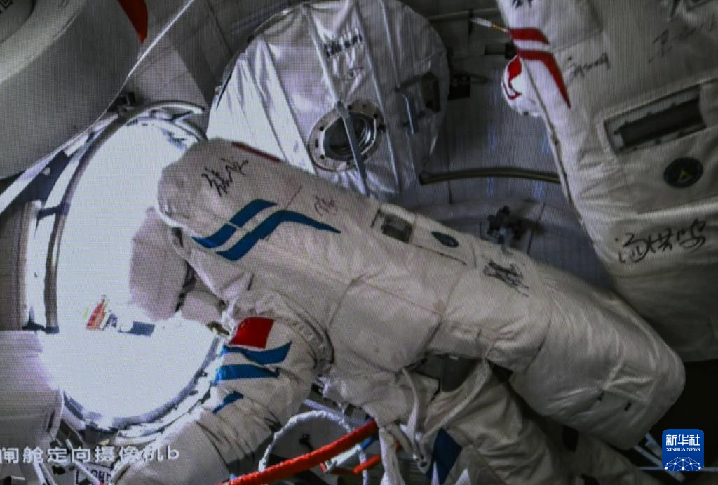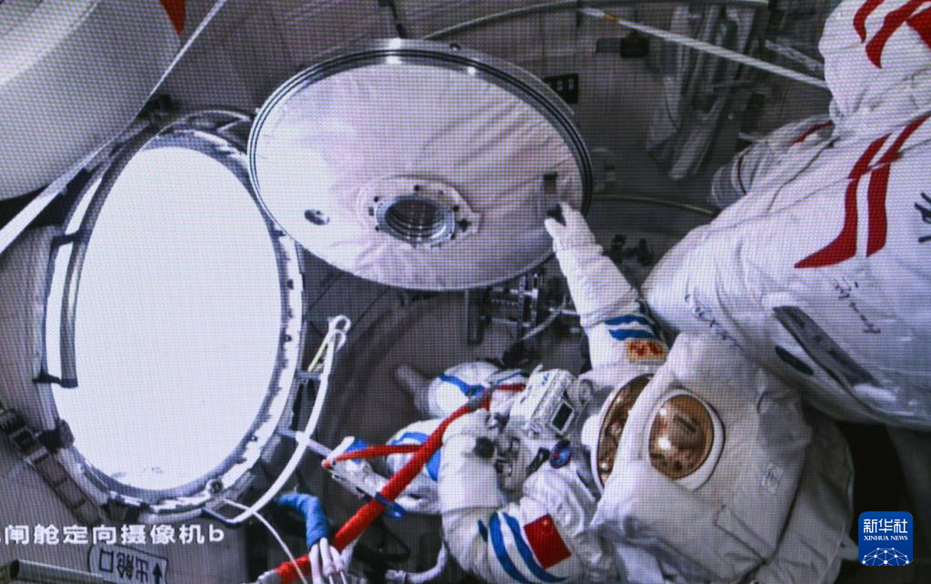 3月2日,在北京航天飞行控制中心拍摄的神舟十七号航天员在出舱作业前打开问天实验舱舱门。