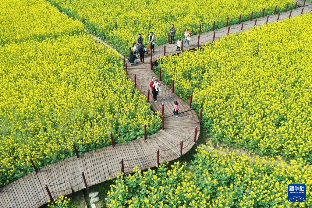 3月2日,游客在贵州省平塘县平舟镇京舟村的油菜花田中游玩(无人机照片)。