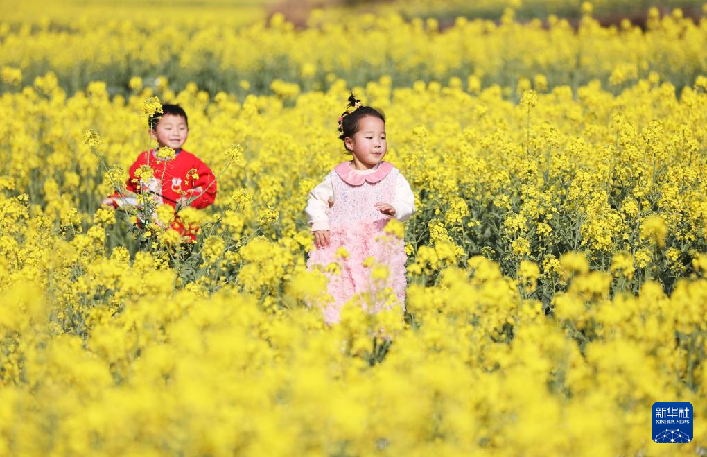 3月2日,小朋友在贵州省锦屏县大同乡稳江村的油菜花田间玩耍。