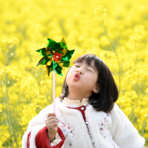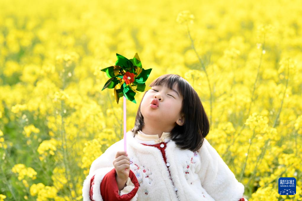 3月2日,一名小朋友在贵州省余庆县白泥镇满溪村的油菜花田间玩耍。