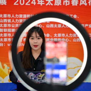 3月2日,工作人员在2024年太原市春风行动大型专场招聘会上直播。
