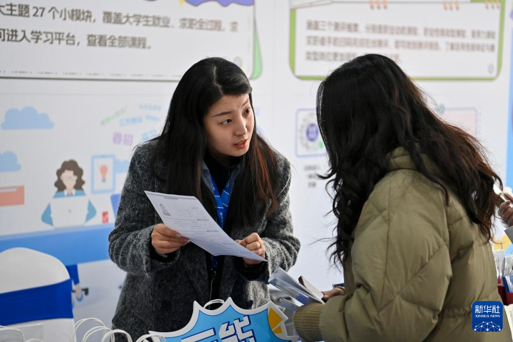 3月2日,2024年太原市春风行动大型专场招聘会设立的法律咨询处的工作人员和求职者交流。