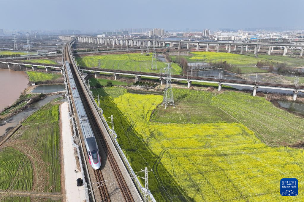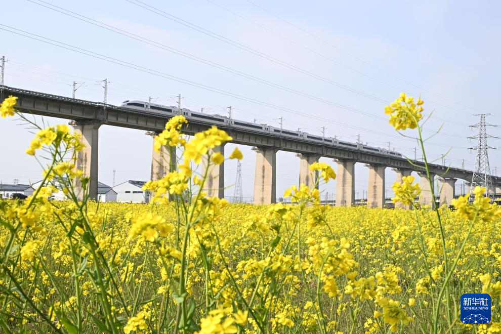 3月2日,一辆高铁列车从江西省南昌市南昌县一处油菜花田旁驶过。