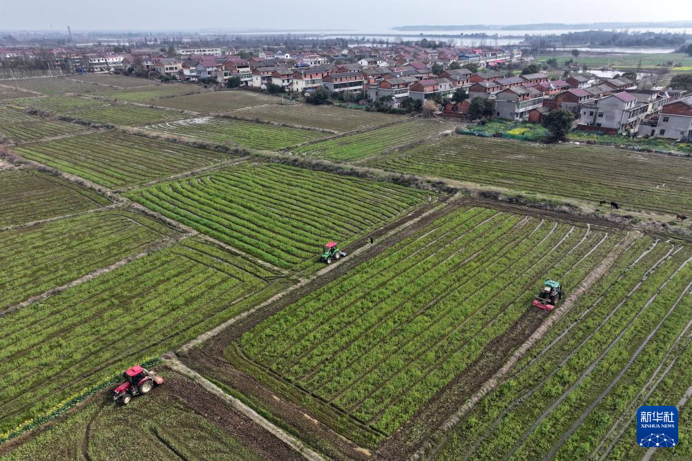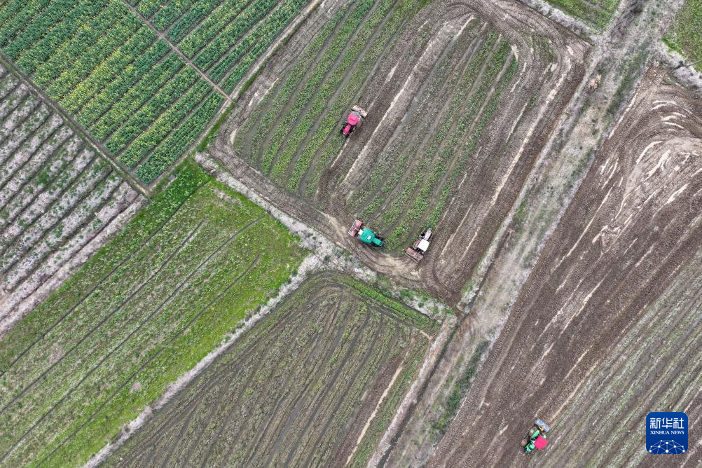 3月2日,在江西省南昌县塔城乡,农民驾驶拖拉机对田地进行翻耕(无人机照片)。