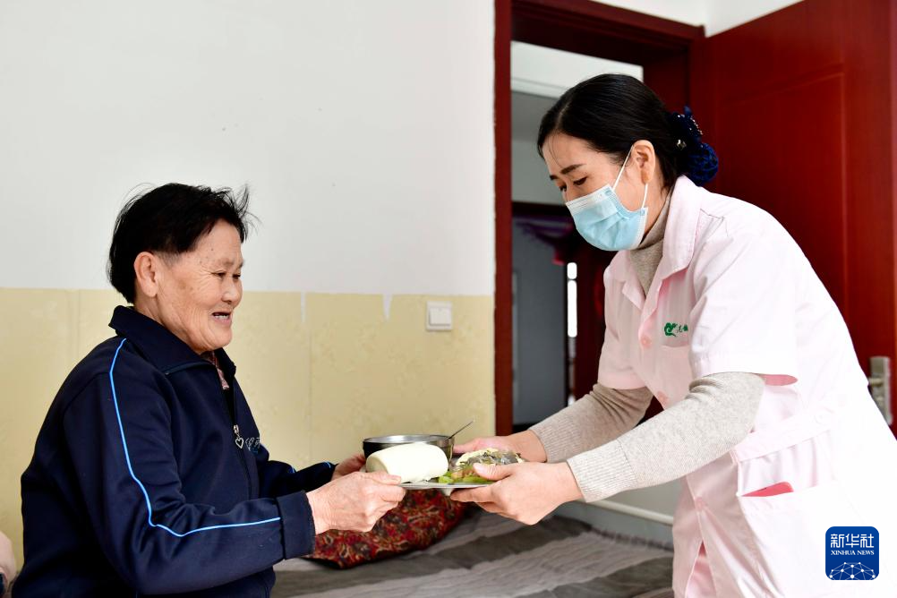 3月2日,在滨州市博兴县博华老年公寓,工作人员为老人送餐。