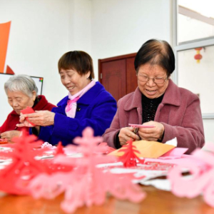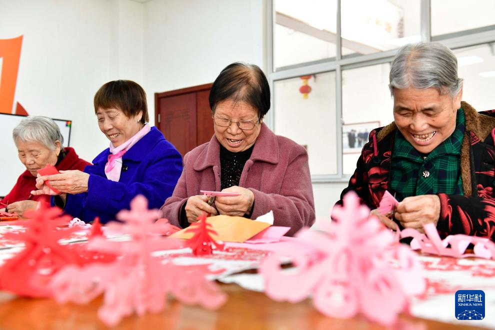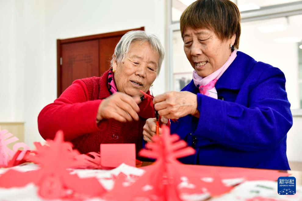 3月2日,在滨州市博兴县博华老年公寓文体活动室,老人们在剪纸。