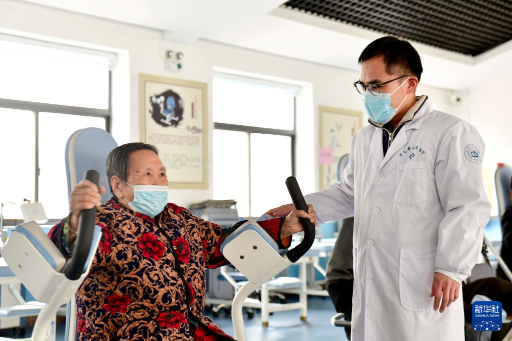 3月2日,在滨州市博兴县博华老年公寓,医护人员指导老人进行康复训练。